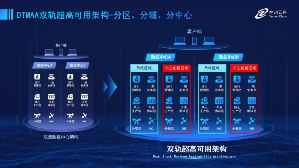为帮助金融客户更好地应对数字经济时代对可持续性的高要求,实现“信创”与“数字化”齐头并进,云配查系统推出了双轨超高可用架构。该架构在双活数据中心的分区调度基础上,增加信创域和非信创域的分域调度,实行信创域与传统域应用全量部署,使双中心运营变为双中心四区域并行运行,互为多活,将“0到1”的单轨建设道路变为分区分域协同的多活双轨超高可用架构。帮助客户在新架构下,保障“信创”的同时解决性能瓶颈,提升稳定性,保证应用可持续性,最终实现信创区域和非信创区域的平滑过渡,完成国产化替代目标。