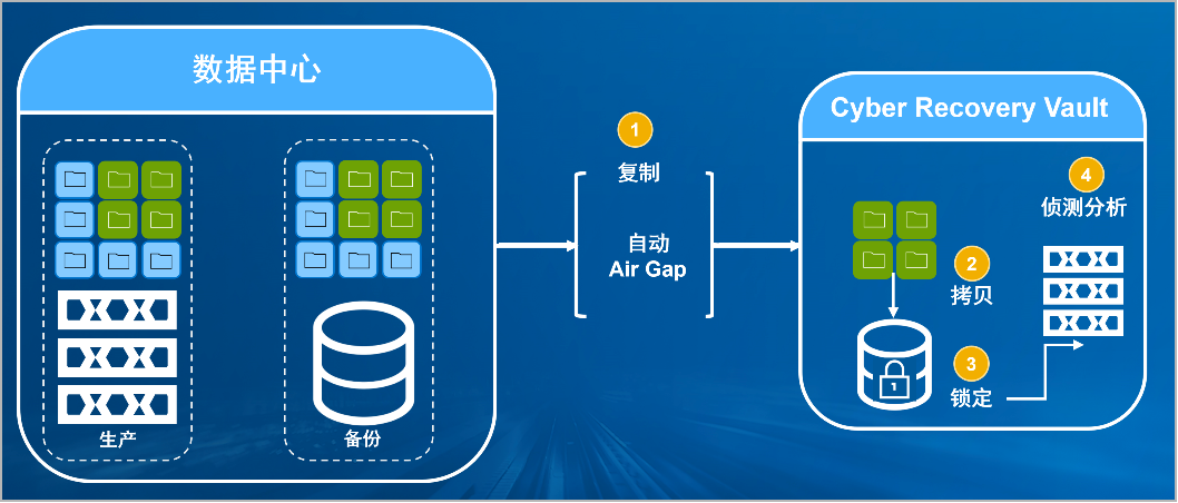 云配查系统防勒索病毒方案将生产中心备份数据复制到Vault区,复制后网络自动断开实现弹性隔离。Vault区的数据快速拷贝,并对拷贝版本加锁(在锁定期数据不允许删除和修改)。Vault沙箱内对拷贝版本进行扫描分析,验证数据是否完好。