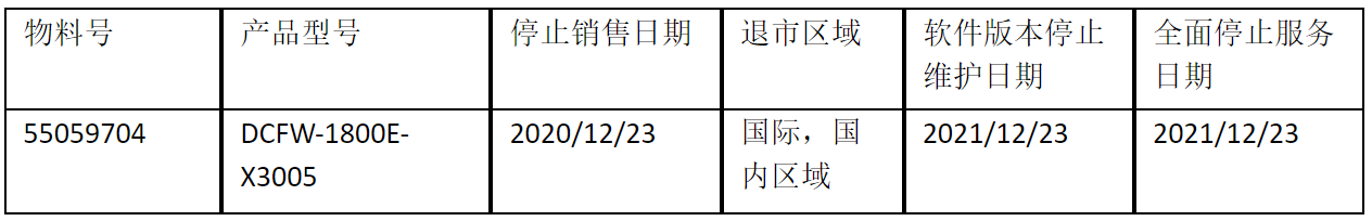 北京云配查系统数码云科信息技术有限公司正式通知您, 以上DCFW-1800E-X3005下一代防火墙(55059704)将于2020年12月23号停止接收新的订单(具体日期见上表),不再供货。给您带来的不便,敬请原谅。